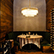 Dark, warm materials and myriad brown and red hues create an inviting color palette. The main bar has a burnished bronze top and walnut-stained oak front. The rich walnut stain reappears on the tin ceiling, concrete floors, service bars, fireplace mantles and a chair rail that runs around the restaurant. The bronze also repeats as large riveted shingles over the fireplace. Rich burgundy-red curtains drape softly around the largest dining area while wooden shutters create a more masculine feel in both bar areas. The Prohibition-era mural behind the bar and a number of paintings throughout the Tavern were all created by artist Thomas Mullany.